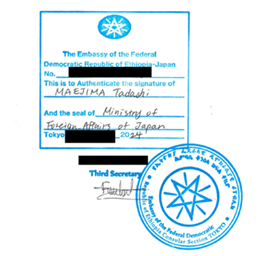 当事務所は、日本で発行された各種文書(書類)をエチオピアに提出する際に求められる駐日エチオピア大使館(住所:東京都港区高輪3-4-1 )の発行する領事認証(英語:Attestation, Legalization)の申請・取得手続きの代行を承っております。